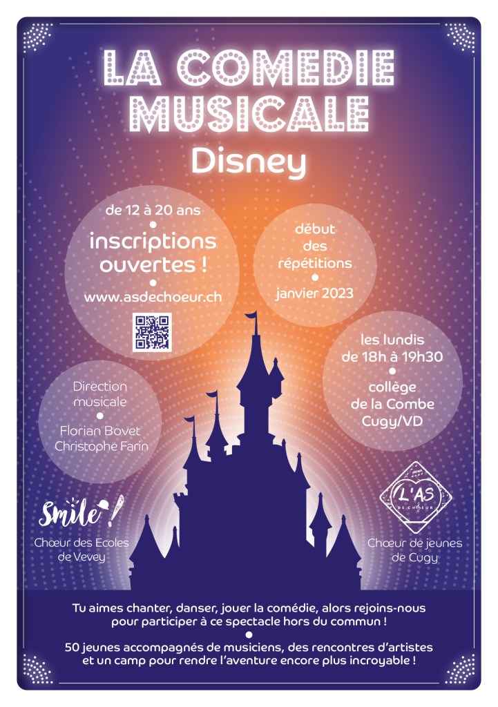 LA comédie musicale inspirée des titres incontournables de Disney, écrite et préparée par les choristes de L’As de Choeur et du choeur SMILE! (choeur des Ecoles de Vevey). Plus de 50 jeunes sur scène pour présenter un spectacle qui fera retourner en enfance petits et grand durant plus d’une heure!